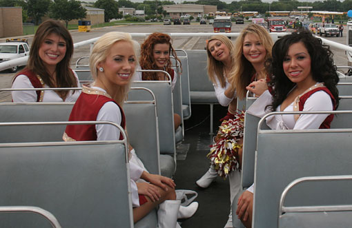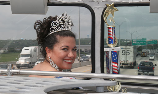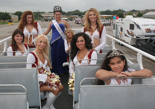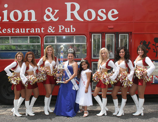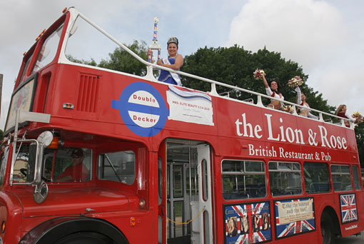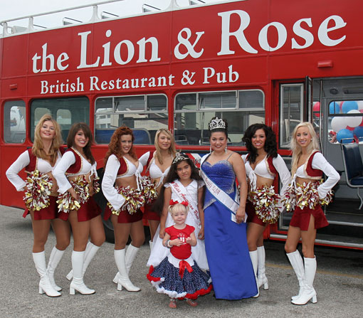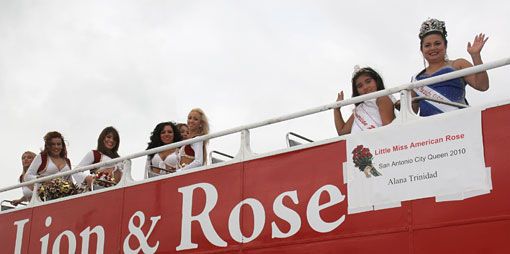 The San Antonio Roses rode on the double decker bus from the Lion & Rose Restaurant & Pub while participating in the 35th Annual Shertz Jubilee Parade on July 3, 2010. The Lion & Rose entry won 1st Place in Private Entries.
